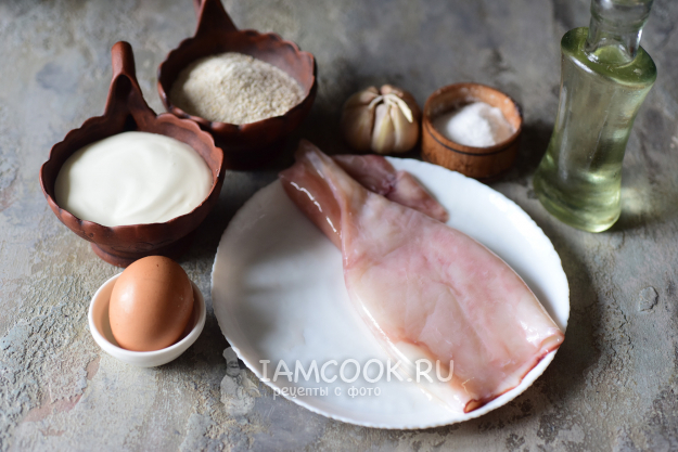 Ингредиенты для приготовления кальмаров в кляре во фритюре представлены на фото. Тушку или тушки кальмаров разморозим при комнатной температуре, почистим от пленочки, удалим хорду и внутренности, хорошенько промоем. Чеснок почистим.