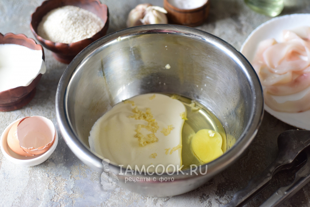 В миску выложим сметану, вобьем яйцо, посолим, через пресс выдавим чеснок.