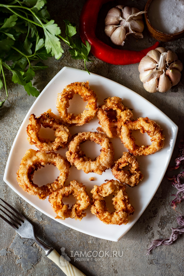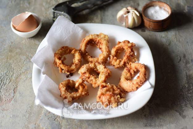 Обжаренных во фритюре кальмаров в кляре выложим на бумажные полотенца, удаляя излишки жира.