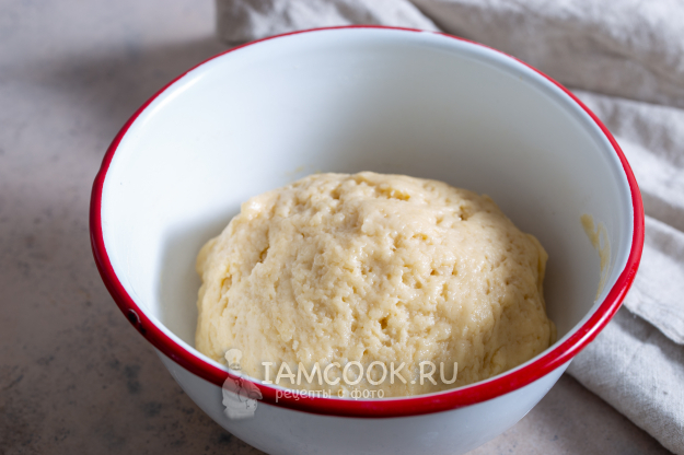 Муку просейте с разрыхлителем и частями всыпайте в тесто. Муки может понадобиться чуть меньше 250 граммов, в зависимости от того какое взяли яйцо и сметану. Тесто легко собирается в шар и не липнет к рукам.