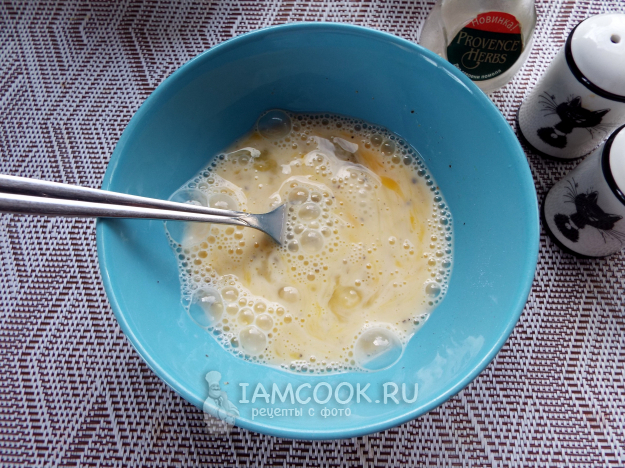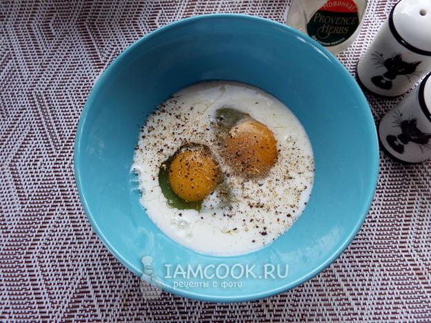 Яйца соединить с молоком, немного подсолить, добавить черный перец и травы.