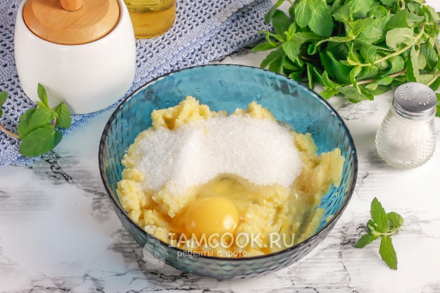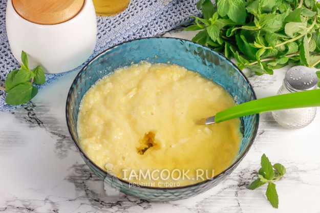 Кукурузную кашу выложите в глубокую емкость. Всыпьте туда же сахар и соль, по желанию - другие сладкие приправы. Вбейте куриное яйцо и тщательно перемешайте всю массу.