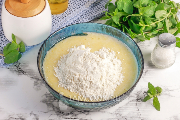 Всыпьте пшеничную муку по частям и разрыхлитель.