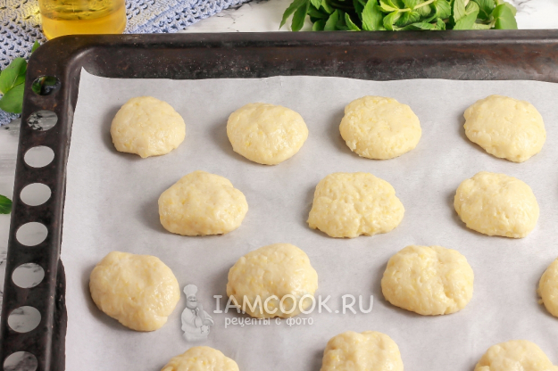 Застелите противень пекарской бумагой, разогрейте духовку до 180 градусов. Разделите тесто на равные части и скатайте каждую из них в руках в колобок. По желанию колобки теста можно обмакнуть в сахар. Выложите их на равном расстоянии друг от друга на бумагу. Поместите противень в духовку на верхний ярус.