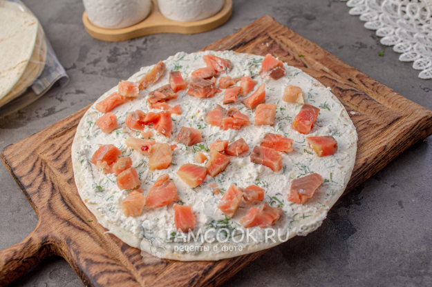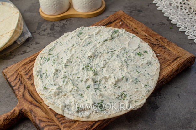 Тортилью достаньте из упаковки и смажьте при помощи лопатки или ножа сливочным сыром с зеленью. Смажьте тонким, ровным слоем и обязательно промажьте и края тортильи.