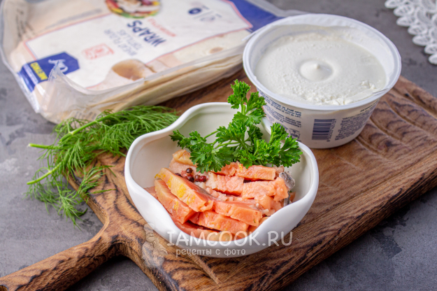 Подготовьте все продукты для рулетиков из тортильи с красной рыбой.