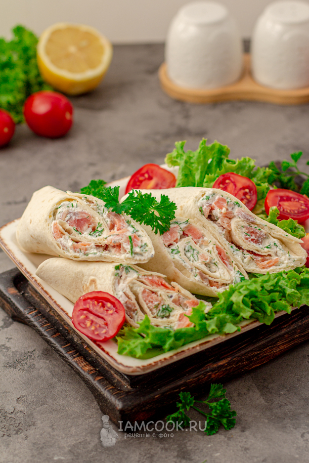 Достаньте рулетики из тортильи с красной рыбой и творожным сыром из холодильника и разрежьте пополам наискосок. Выложите на блюдо с листьями салата. Подавайте со свежими овощами. Приятного аппетита!!!