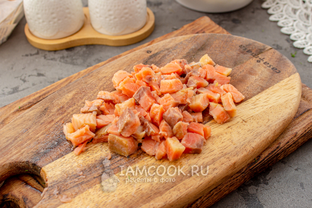 Филе малосольной форели нарежьте на небольшие кусочки.