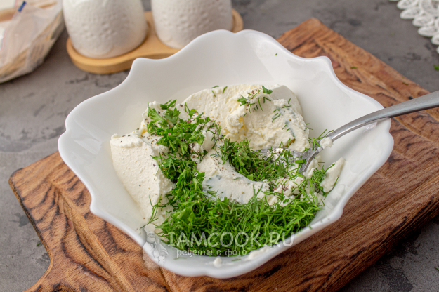 Зелень мелко порубите и смешайте с творожным сливочным сыром, по вкусу поперчите. Перемешайте.