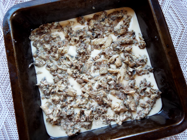 Сверху разложить рыбу, которую надо заранее размять вилкой, но без фанатизма.