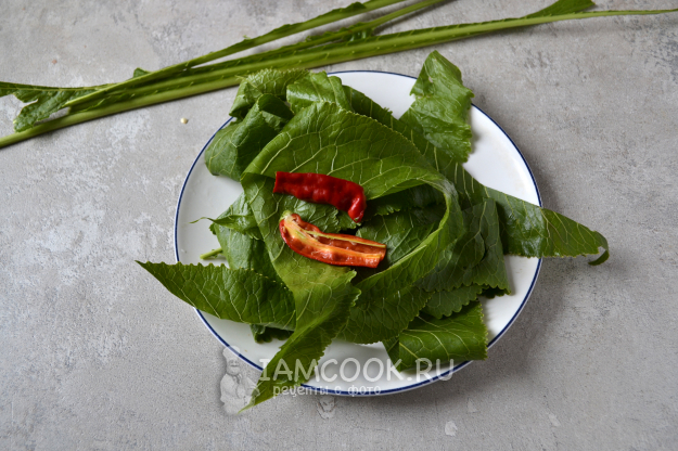 Острый перчик разрежьте, уберите семена. Листья хрена срежьте со стеблей. Для соуса нужны только мягкие листья.