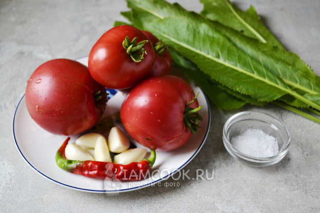 Продукты для заготовки соуса из помидоров и листьев хрена на зиму подготовьте по списку ингредиентов. Все овощи тщательно вымойте, обсушите.