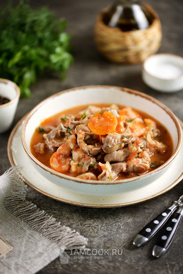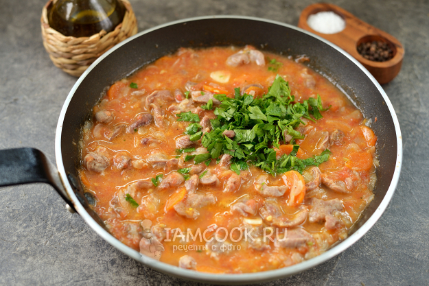 Тушеные куриные желудки с помидорами готовы. Подавайте к столу с любимым гарниром.