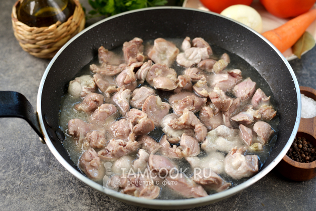 Тщательно промойте желудки под проточной водой, разрежьте каждый пополам, дайте полностью стечь воде. Разогрейте в сковороде растительное масло, выложите в него субпродукт, обжарьте пару минут на сильном огне.