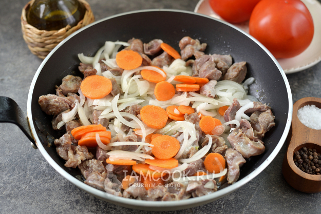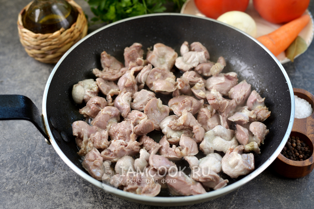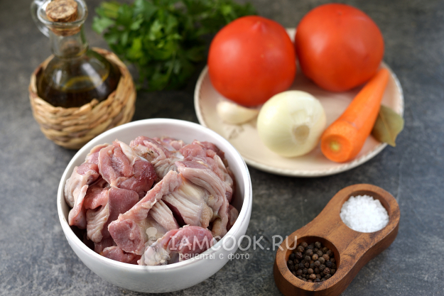 Все продукты, необходимые для приготовления тушеных куриных желудков с помидорами - перед вами.