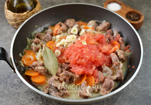 На крупных помидорах вырежьте место плодоножки, разрежьте их на четвертинки. Натрите мякоть на крупной терке, выбросьте кожуру, мякоть вместе с соком добавьте в сковороду, также положите чеснок пластинками и лавровый лист. Подлейте еще воды, перемешайте, тушите желудки с овощами около 5-7 минут.