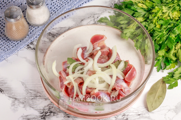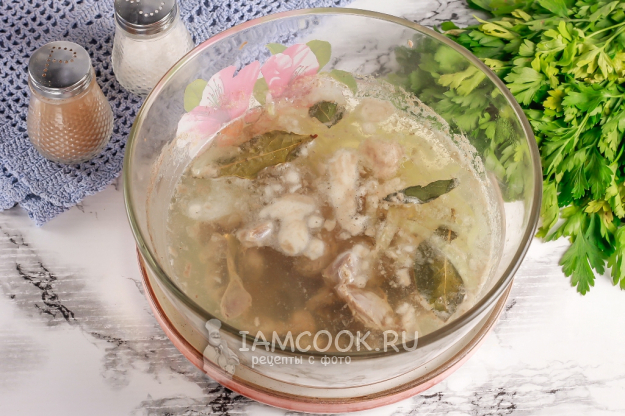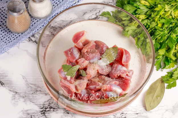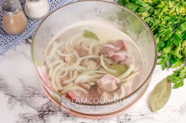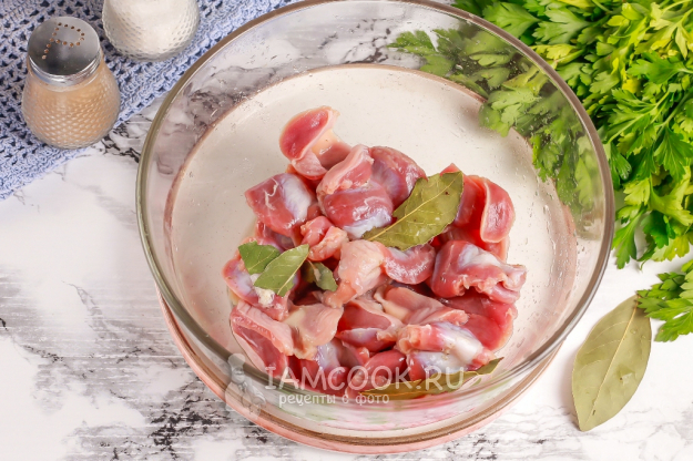 Выложите желудки в глубокую емкость без серебристых или золотистых рисунков. Добавьте лавровые листья.