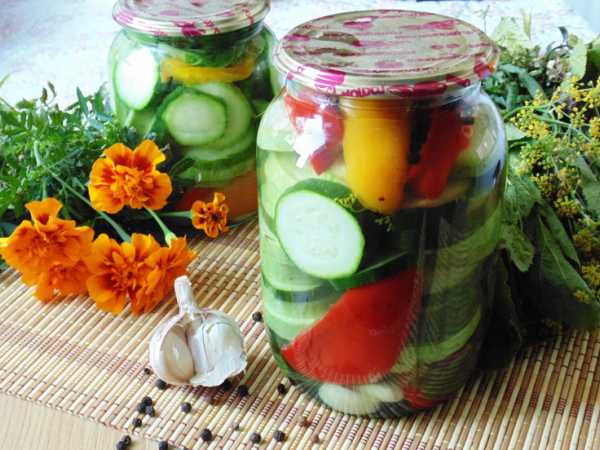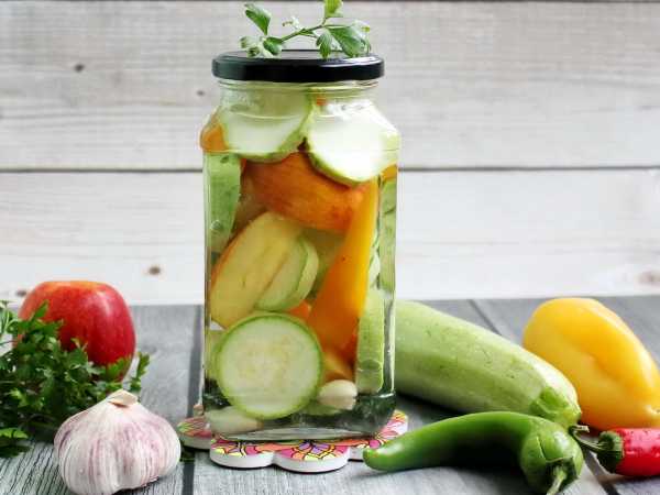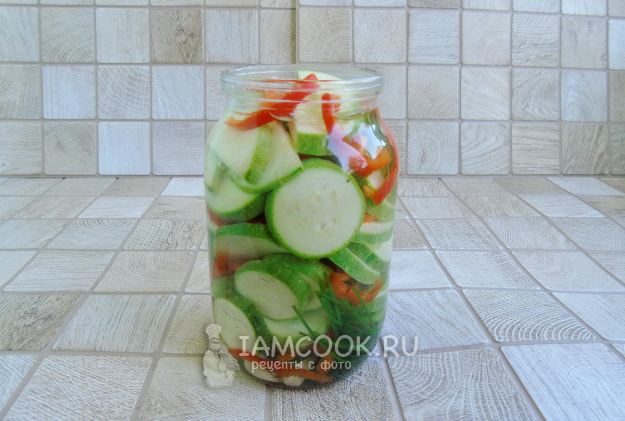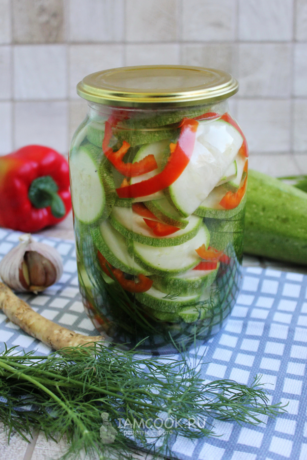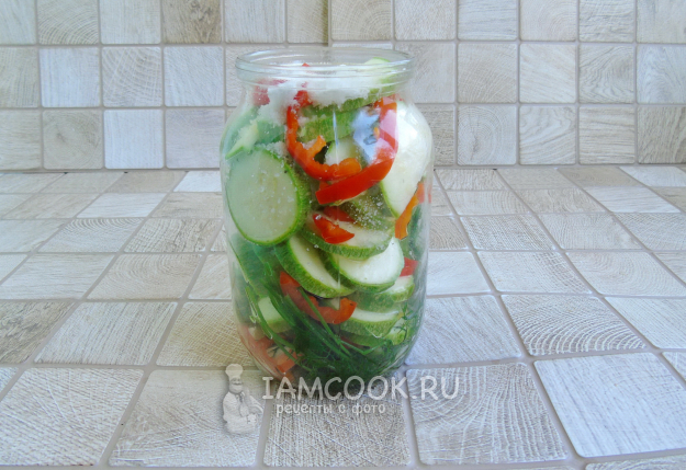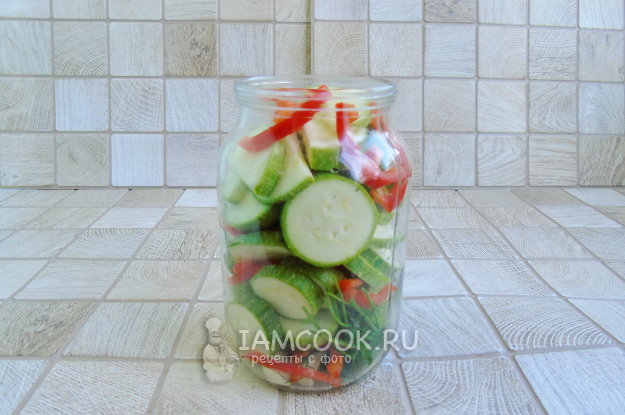 Выложите в банку кабачки и перец слоями.