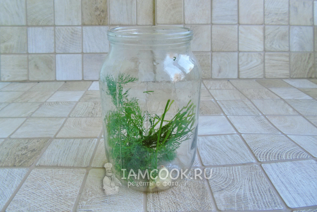 В стерилизованную банку выложите укроп и несколько зубчиков чеснока.
