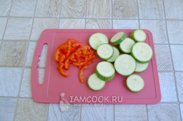 Кабачки помойте и нарежьте кружками, если они мелкие, и половинками кружков крупные. Перец болгарский помойте, очистите от семян и нарежьте произвольно. Я нарезала соломкой.