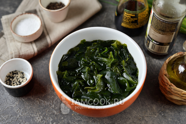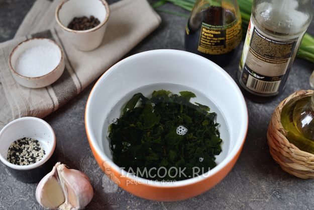 Водоросли переложите в глубокую мисочку, залейте теплой водой, отставьте в сторону.