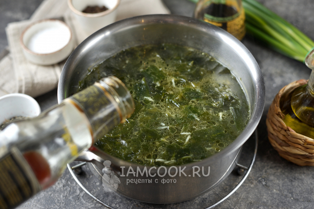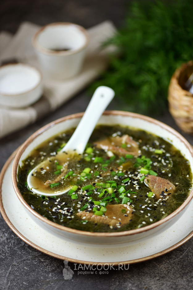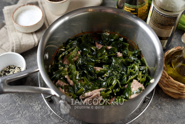 Переложите к мясу водоросли и жарьте еще минуту. Влейте теплую воду, доведите суп до кипения, варите минут 15.