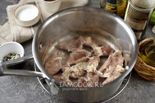 Когда мясо хорошо побелеет, добавьте измельченный чеснок, жарьте еще минуту.