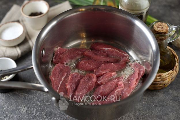 Разогрейте в сотейнике или кастрюле с толстым дном растительное масло (в оригинале - кунжутное), выложите в него нарезанную тонкой соломкой говядину, обжаривайте несколько минут.