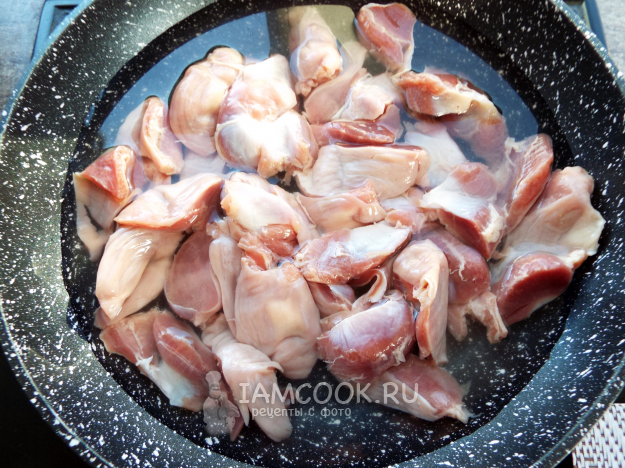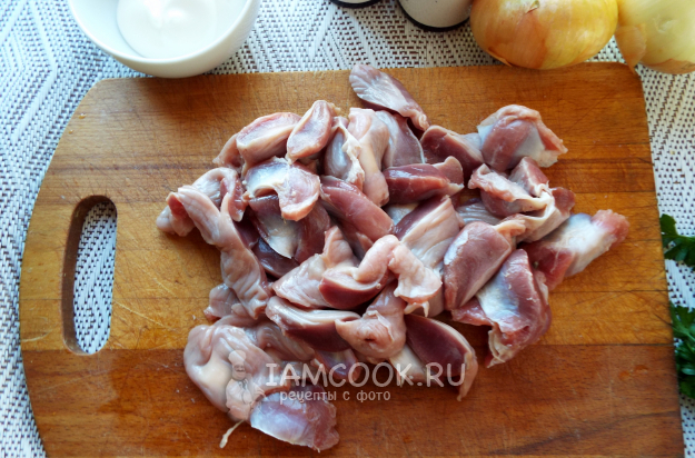Чистые желудки нарезать небольшими кусочками. Я резала один на три кусочка.