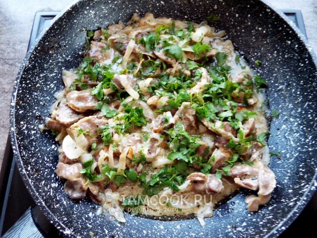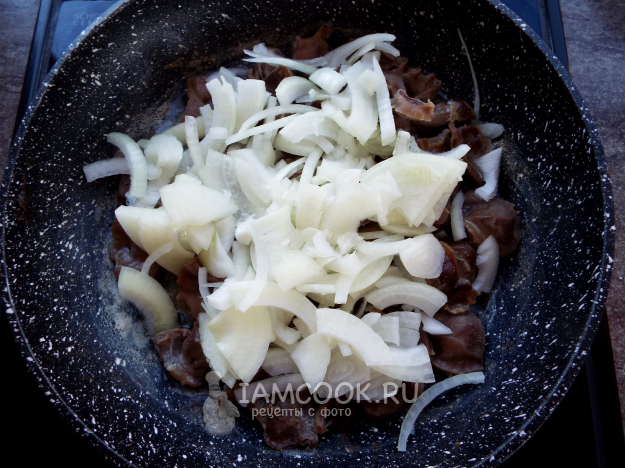 В сковороду с желудками (уже без воды) налить масло и выложить лук.