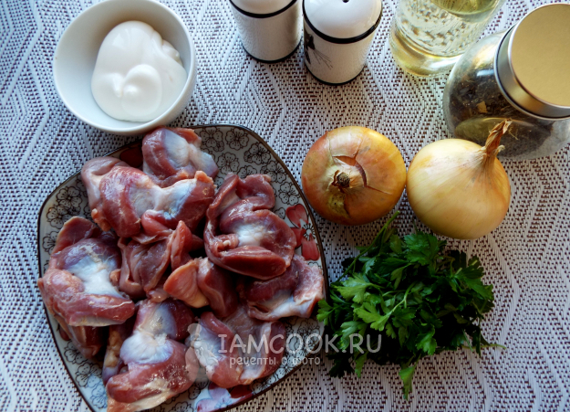 Необходимый набор продуктов для приготовления тушеных куриных желудков в майонезе на сковороде представлен на фото.