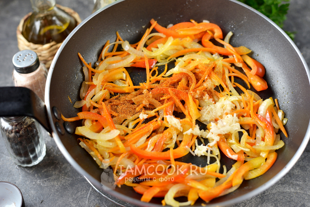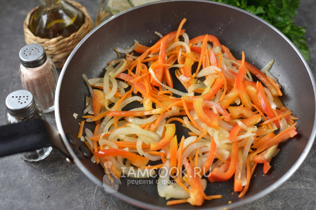Лук, морковь, болгарский перец почистите, нарежьте одинаковой тонкой соломкой. Слегка пассеруйте овощи в растительном масле, они должны стать чуть мягкими, но не золотистыми.