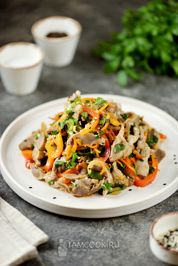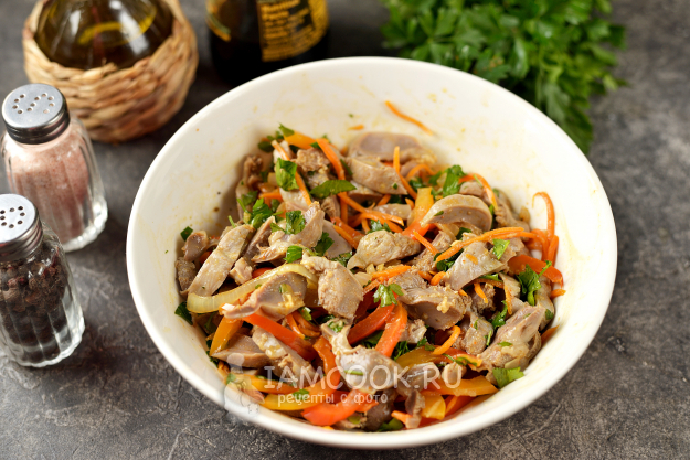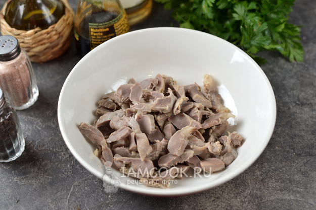 Куриные желудки нарежьте соломкой, переложите в глубокую миску.