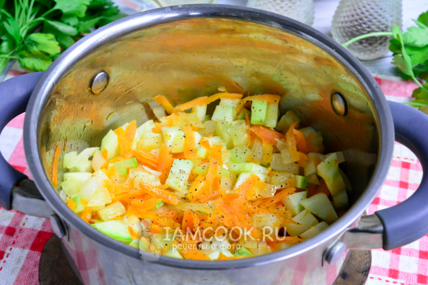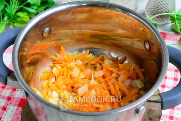 Разогрейте немного растительного масла в кастрюле, всыпьте лук с морковкой и пассеруйте овощи 2-3 минуты на среднем огне, помешивая.