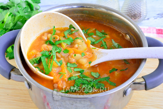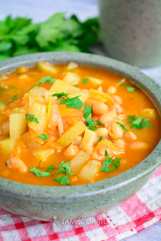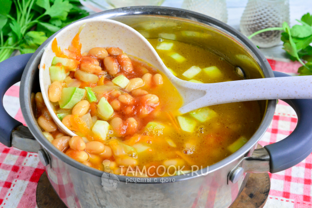 Горячий овощной суп с фасолью и кабачками подавайте к столу.