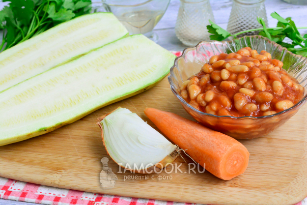 Подготовьте продукты для постного овощного супа с фасолью и кабачками.