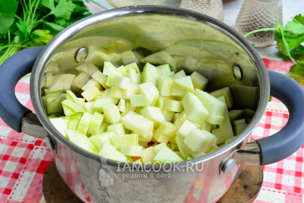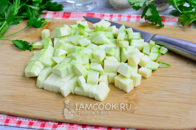 Кабачки нарежьте средними кубиками. Для рецепта советую использовать молодые плоды, чтобы не срезать кожуру и твердые семена внутри.