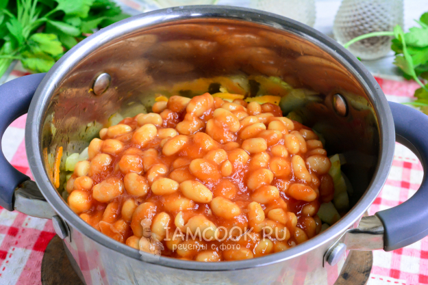 Выложите в кастрюлю консервированную фасоль в томате вместе с соусом.