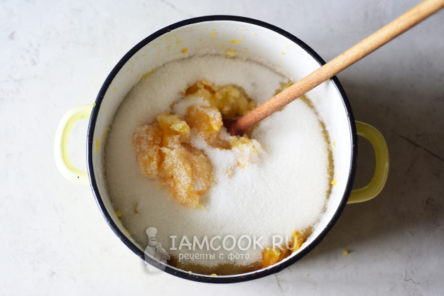 Добавим весь сахар. Поставим кастрюлю на плиту.