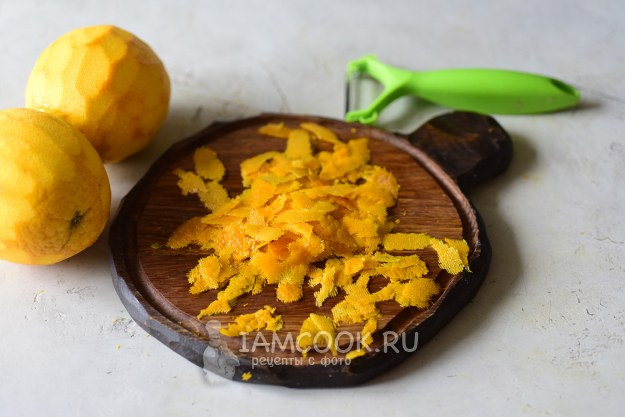 Овощечисткой снимем с апельсинов желтый слой цедры.