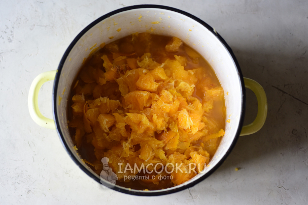 Сами апельсины очистим от кожуры и по возможности освободим мякоть от белых пленочек-перегородок - тоже достаточно быстро делается. Очищенную мякоть апельсинов и цедру добавим в кастрюлю к сливам.