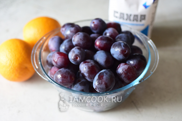 Продукты для заготовки джема из слив с апельсином на зиму - перед вами (и в списке ингредиентов). Сливы и апельсины помоем. Банки и крышки для консервации простерилизуем удобным способом.