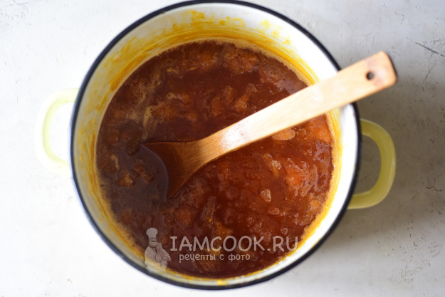 Будем варить джем на небольшом огне, постоянно помешивая деревянной ложкой, с момента закипания час. Степень густоты готового джема напрямую зависит от времени уваривания - у меня получился очень густой джем, поэтому можете самостоятельно корректировать время варки, если вам нужна менее плотная консистенция.