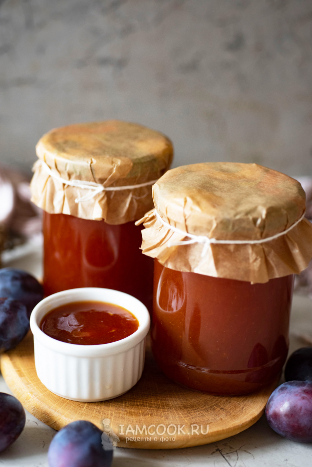 Горячий сливовый джем с апельсином разложим по стерилизованным банкам.