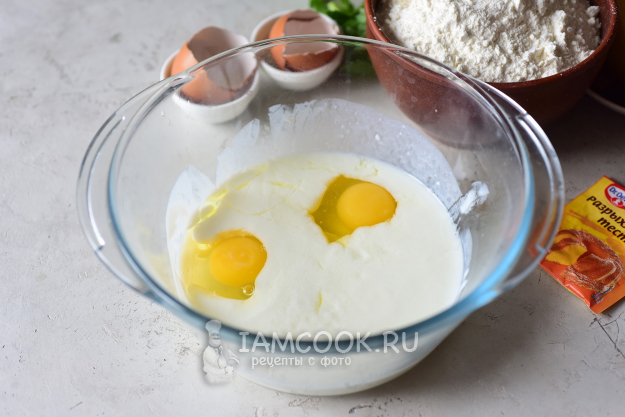 В миску зальем кефир, вобьем яйца, добавим соль. Перемешаем.