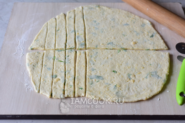 Рабочую поверхность припылим мукой и раскатаем тесто в пласт толщиной в 0,4-0,5 см. Нарежем на ленты шириной в 1-1,5 см.