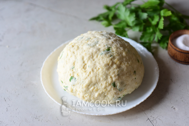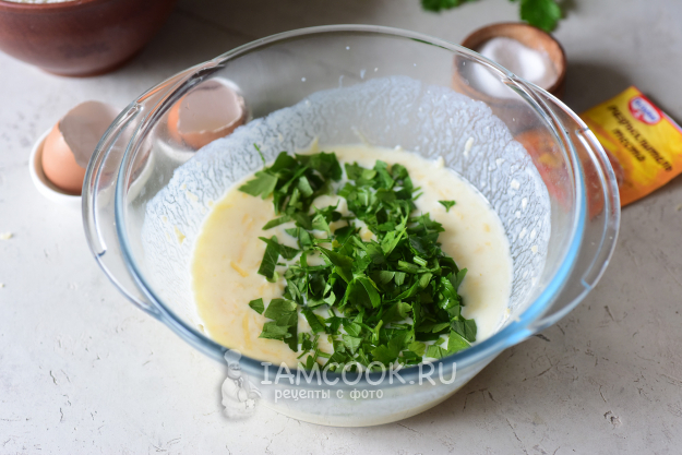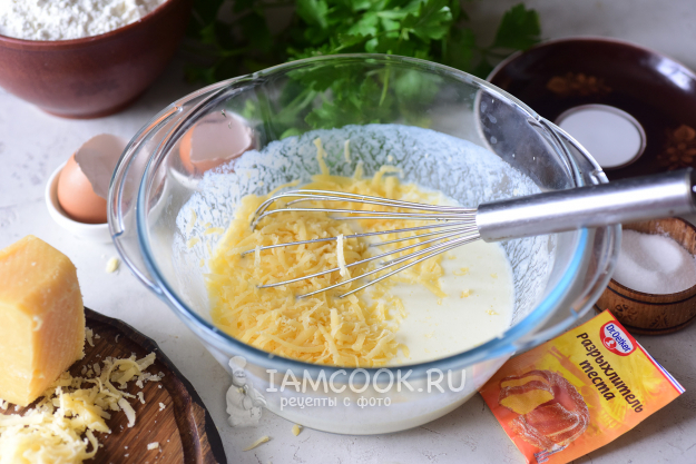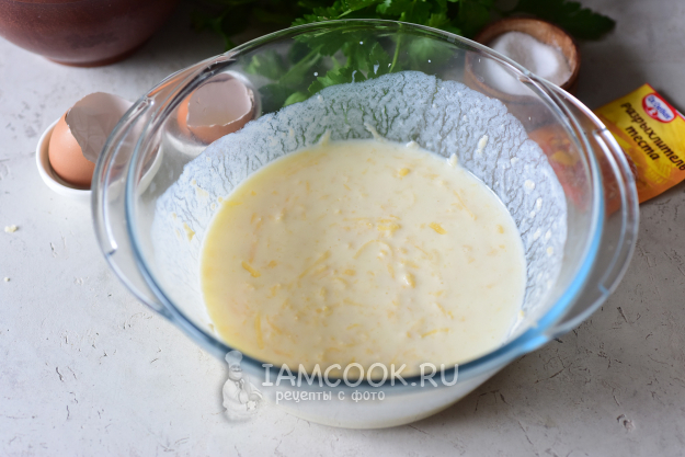 Добавим в кефирную смесь сыр, натертый на крупной терке.
