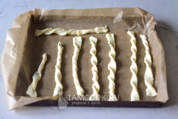 Противень застелем пищевым пергаментом, выложим заготовки, будем выпекать сырные палочки на кефире в духовке, разогретой до 180 градусов, примерно 15 минут - до золотистой корочки.
