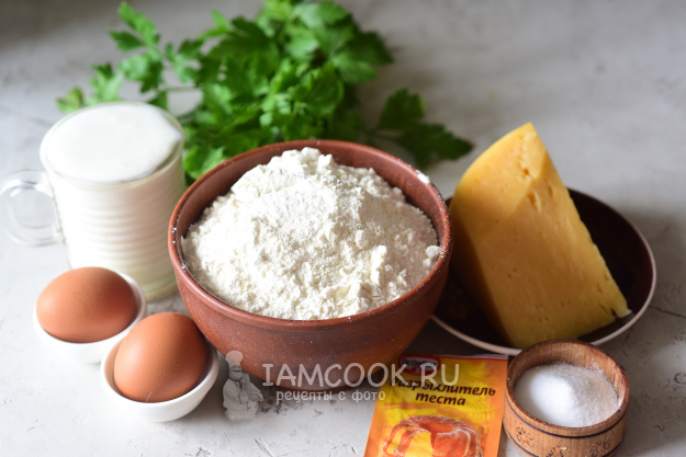 Возьмём необходимые ингредиенты для приготовления сырных палочек на кефире в духовке.
