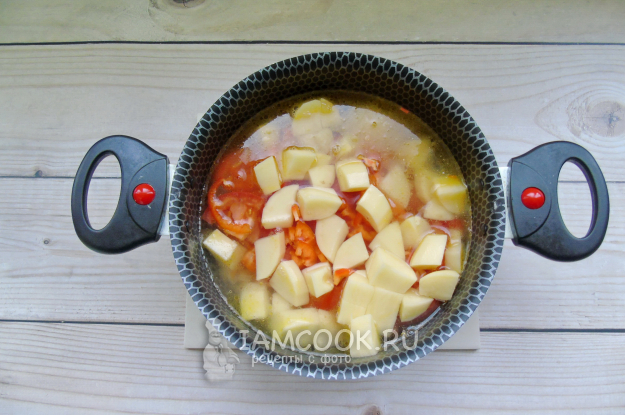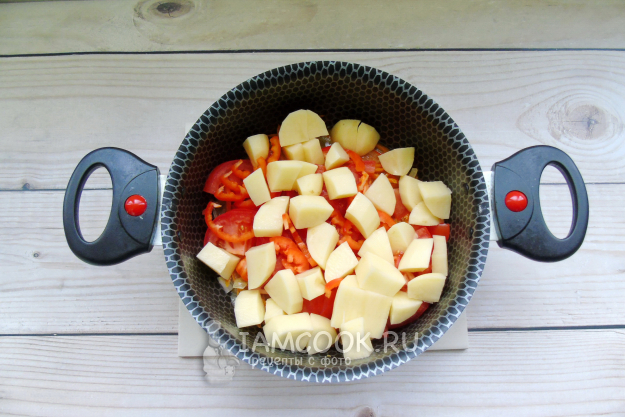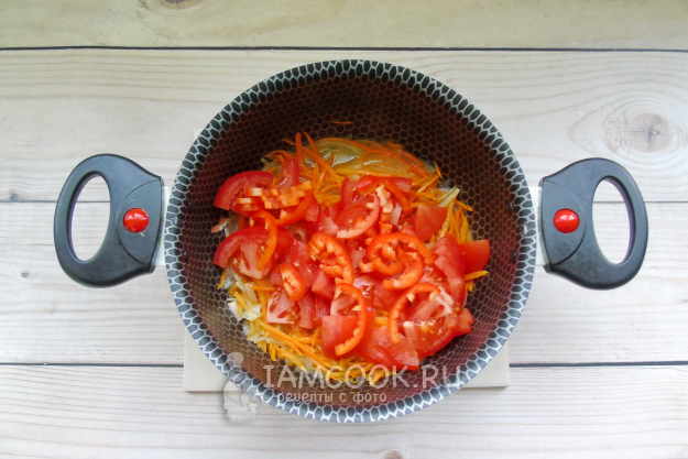 Обжаривайте лук с морковью 7-8 минут. После добавьте нарезанные помидоры и болгарский перец. Обжарьте все эти овощи еще несколько минут.